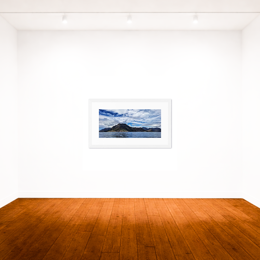 The deep dark blue ocean colours and dark reflection of the mountain range create a moody theme. This is ideal for and space where deep reflection is offered.