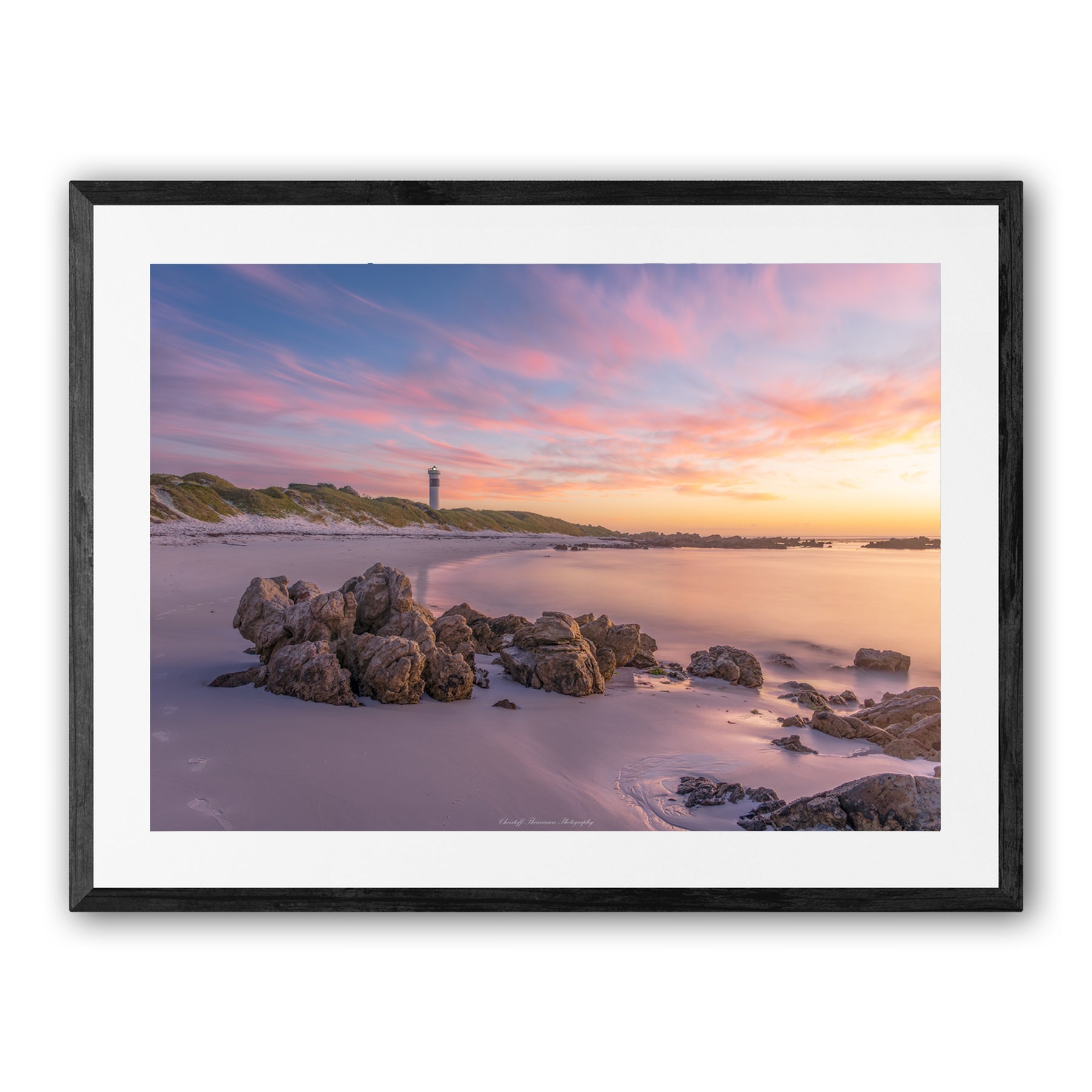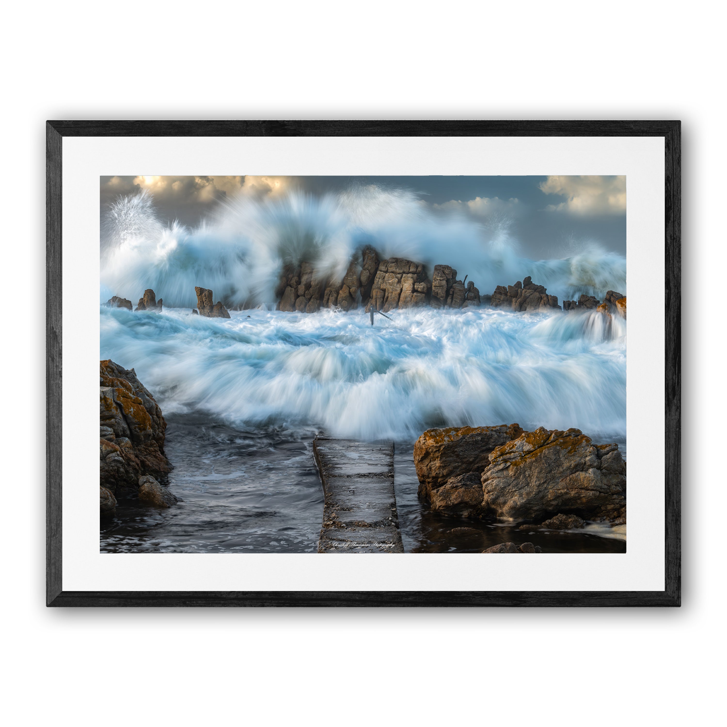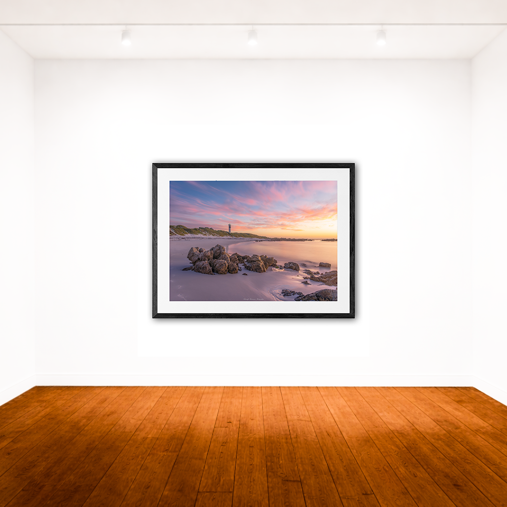 Each print is surrounded by an 80mm white border (mat) and finished with a 35mm frame. This results in the following final framed sizes: