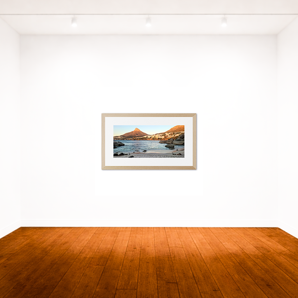 Clifton Beach unfolds in a quiet dialogue between land and sea, where the pale sand meets the Atlantic’s deep blues. In the distance, Lion’s Head rises with unmistakable clarity, its sculptural silhouette anchoring the horizon and lending a sense of scale and permanence to the scene. The mountain’s presence contrasts with the softness of the shoreline, creating a balanced composition of strength and calm.