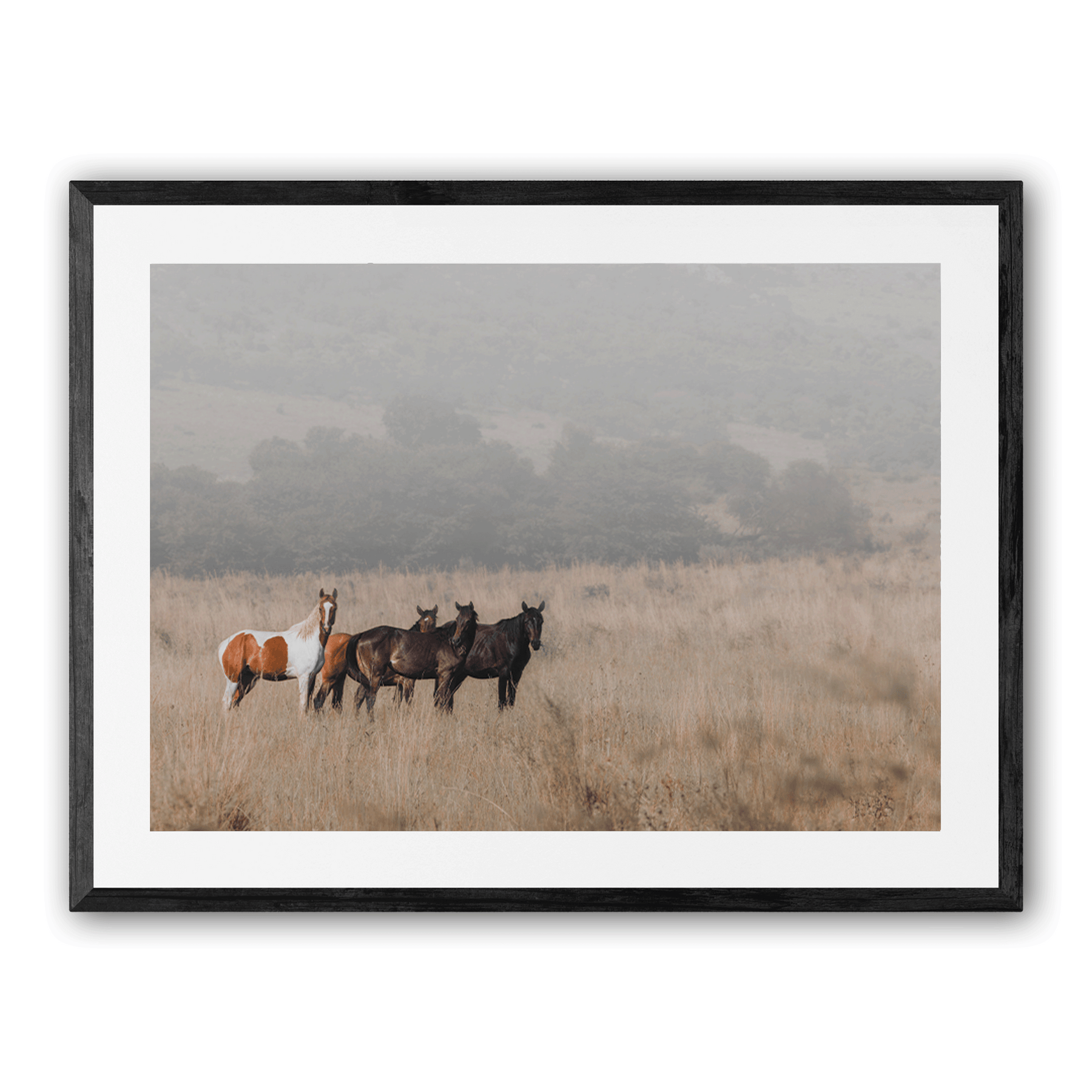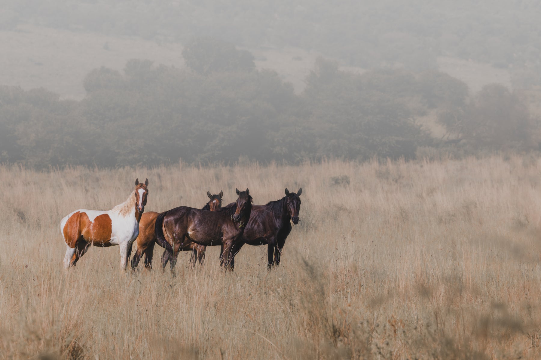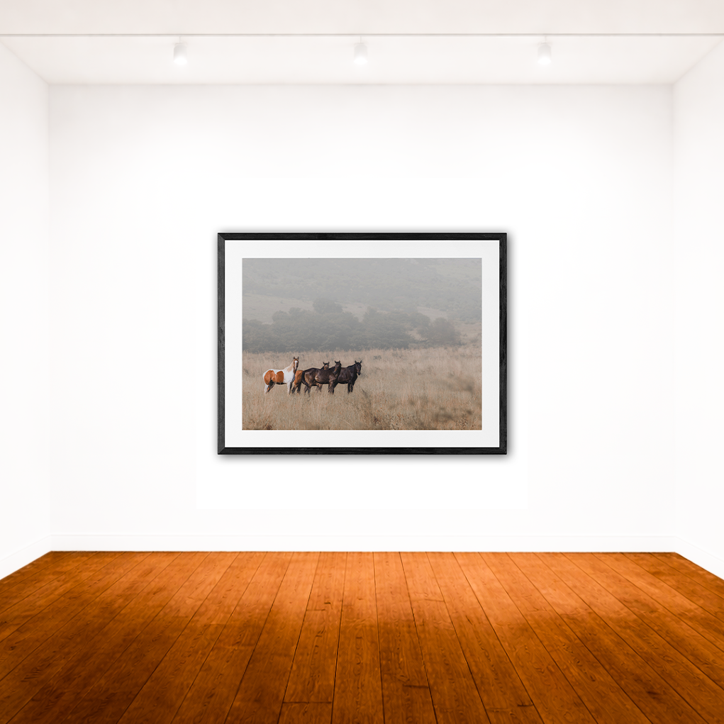 A moment of stillness as wild horses stand together in tall grass — understated, natural, and timeless.