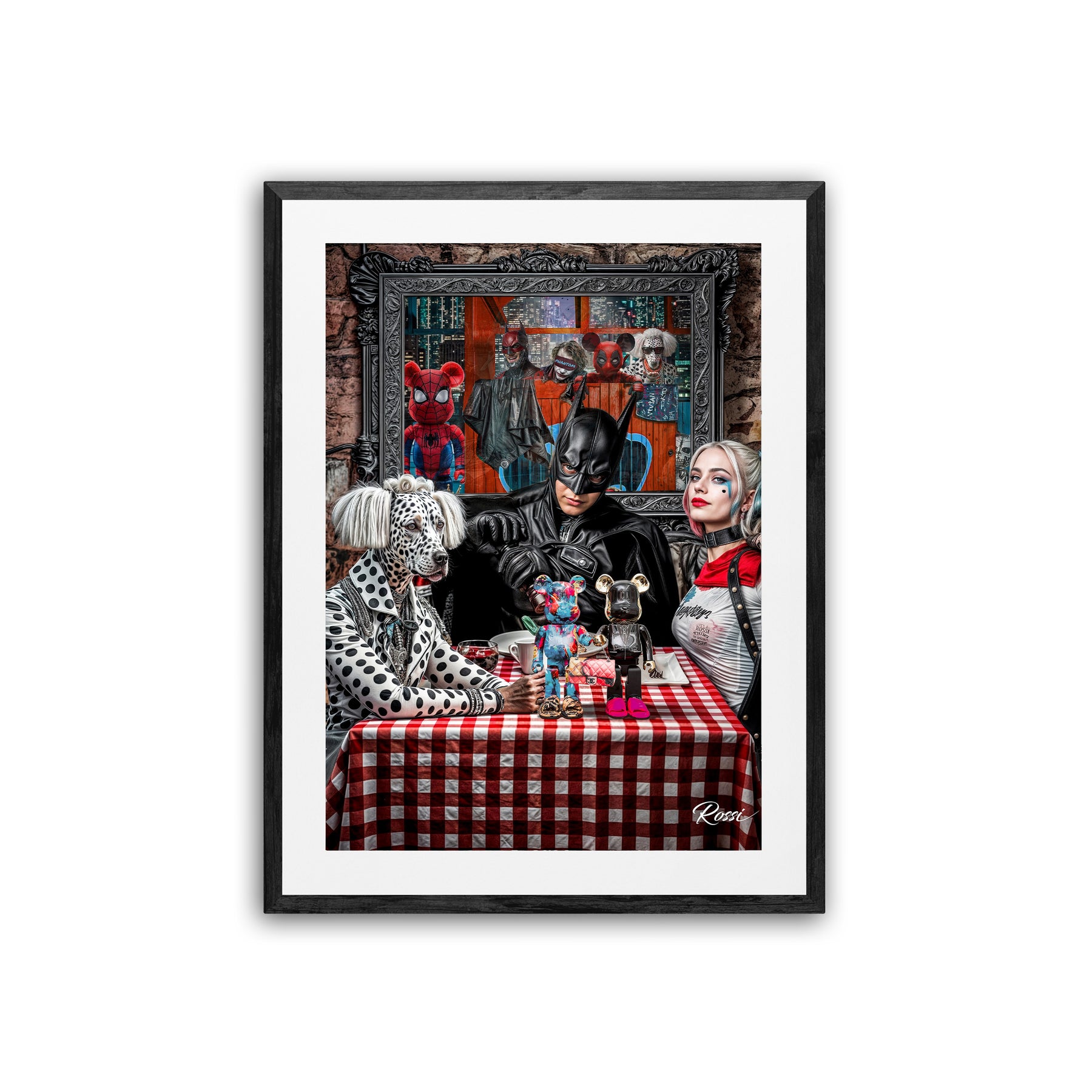 “The Last Supper of Chaos” brings together a Dalmatian person, Batman, and Harley Quinn in a playful yet surreal tableau. The scene blends pop culture and imagination, capturing mischief, contrast, and the unexpected harmony of unlikely companions.