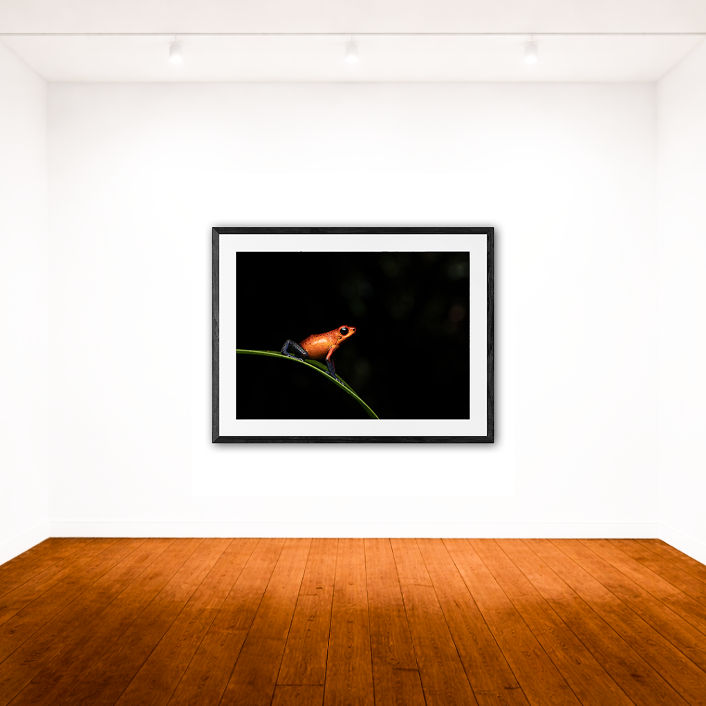 A small strawberry poison dart frog steadies itself along a single leaf, suspended against deep shadow.